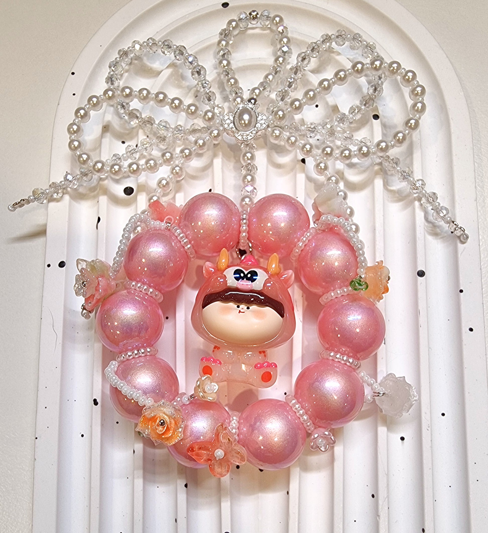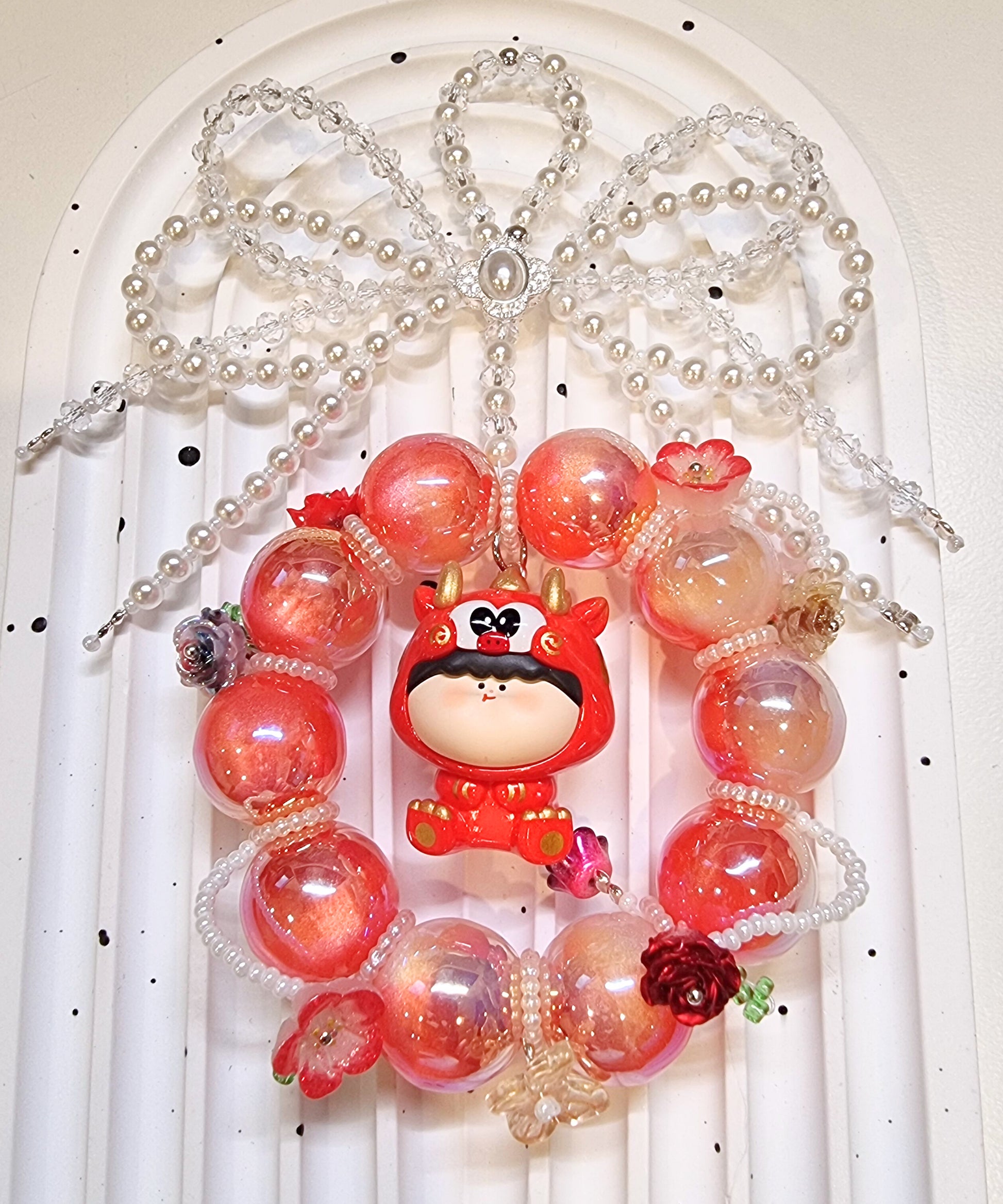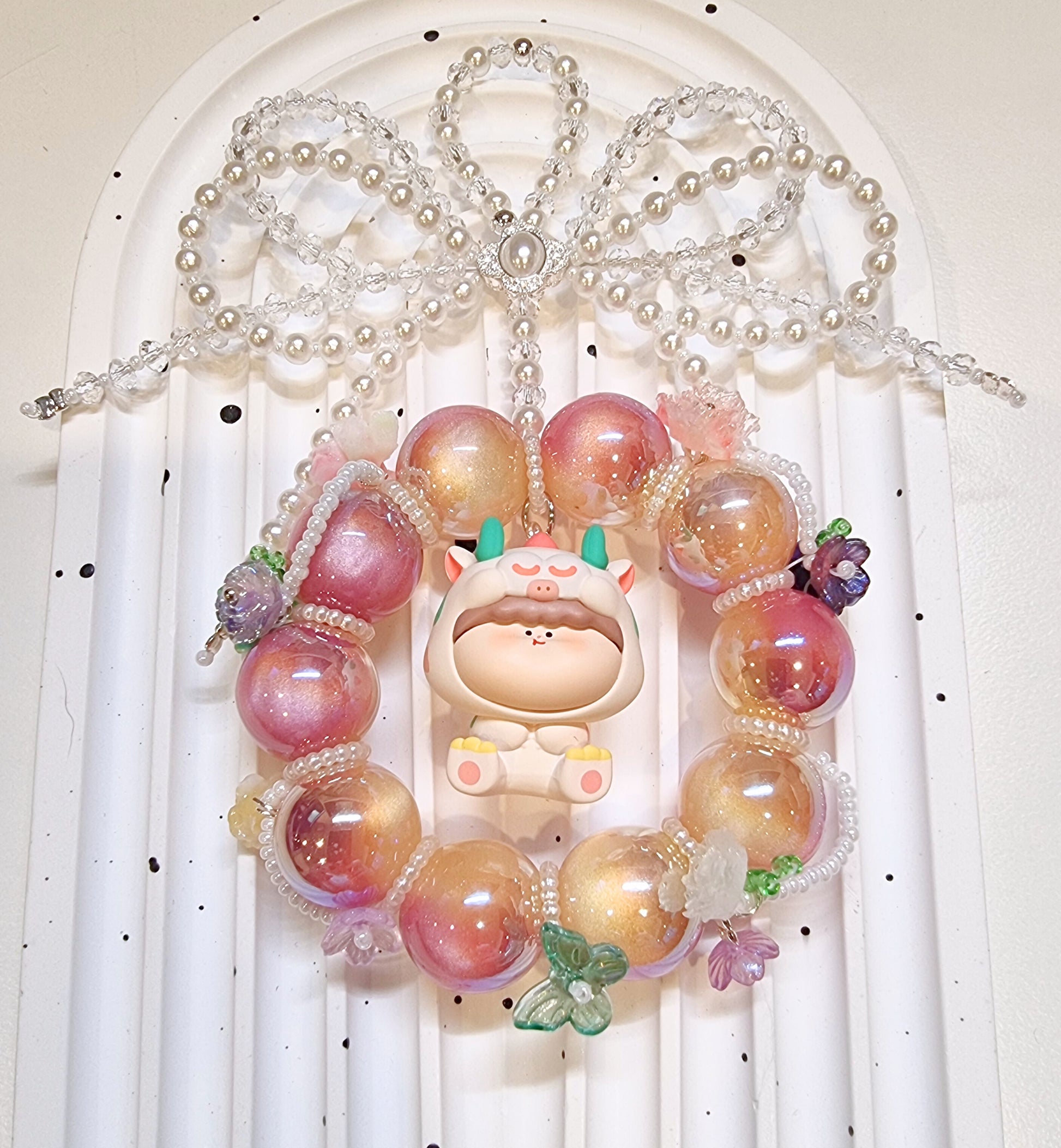 Introducing the Amlls Dragon Charms - the perfect accessory for dragon lovers! These handmade charms feature authentic Amlls dragon beans, delicate flowers, pearls and crystal bows. Comes with a keyring (not in pic). A charming addition to any bag or keychain.