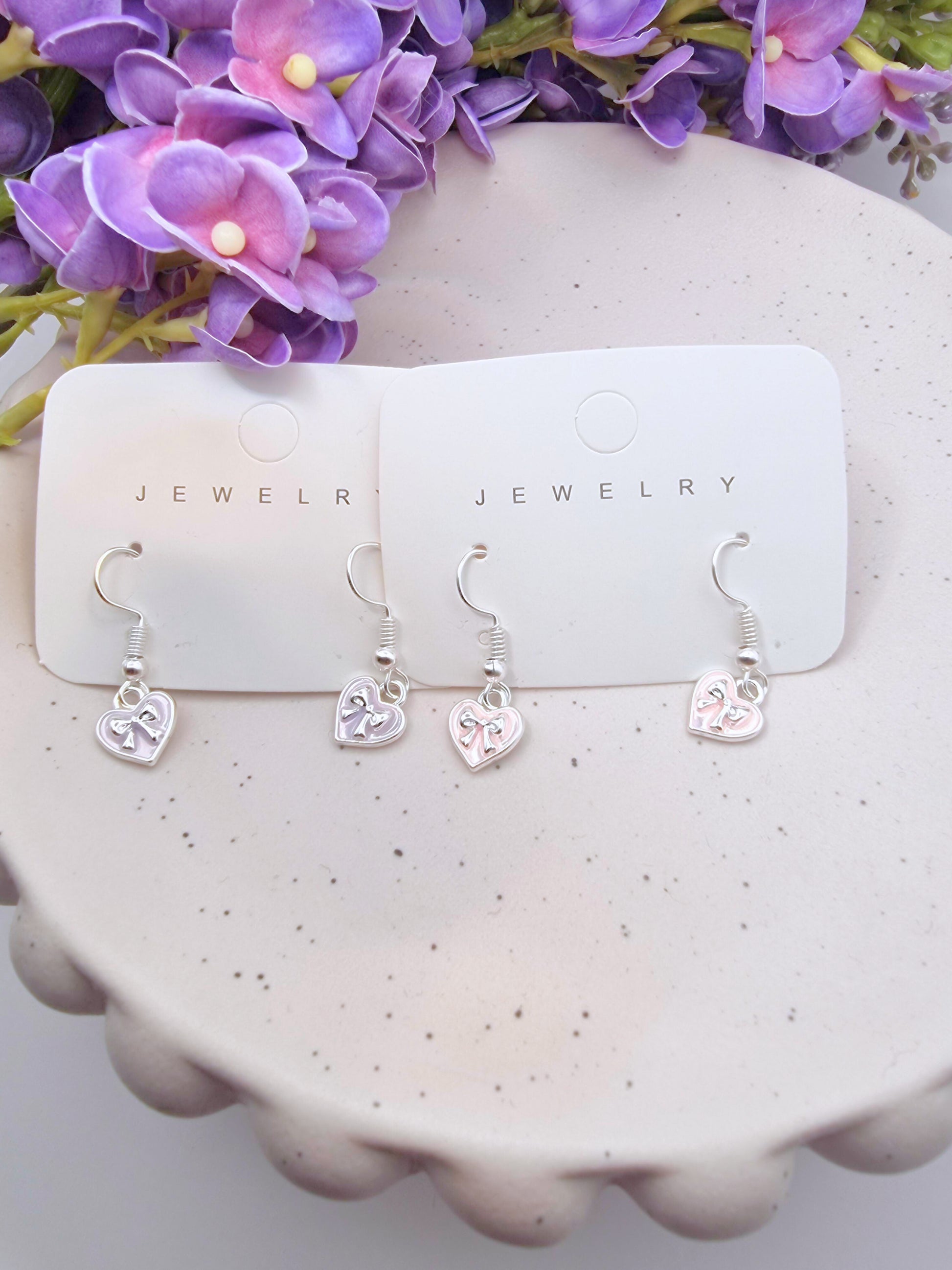 Add a touch of charm with these playful heart-shaped earrings featuring a delicate bow motif. Available in two lovely colours, they’re perfect for brightening up any outfit with a sweet and fun vibe.